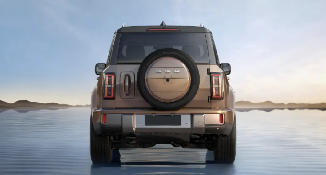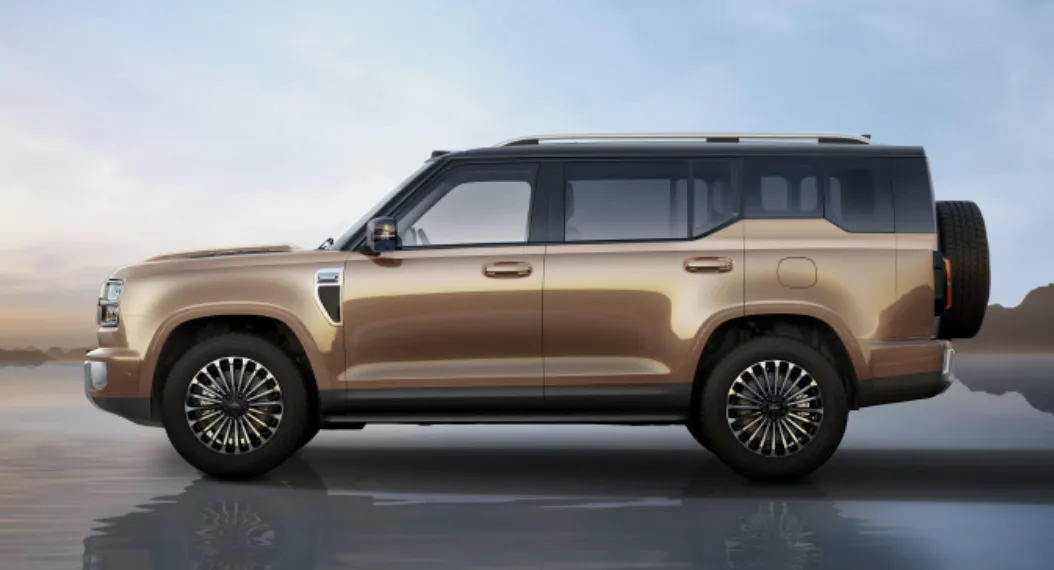 A柱与车顶采用直角转角设计,搭配宽体轮眉和大尺寸密封式轮圈,整体风格粗犷而有秩序感。车尾近乎垂直的后窗与外挂备胎进一步凸显越野属性。