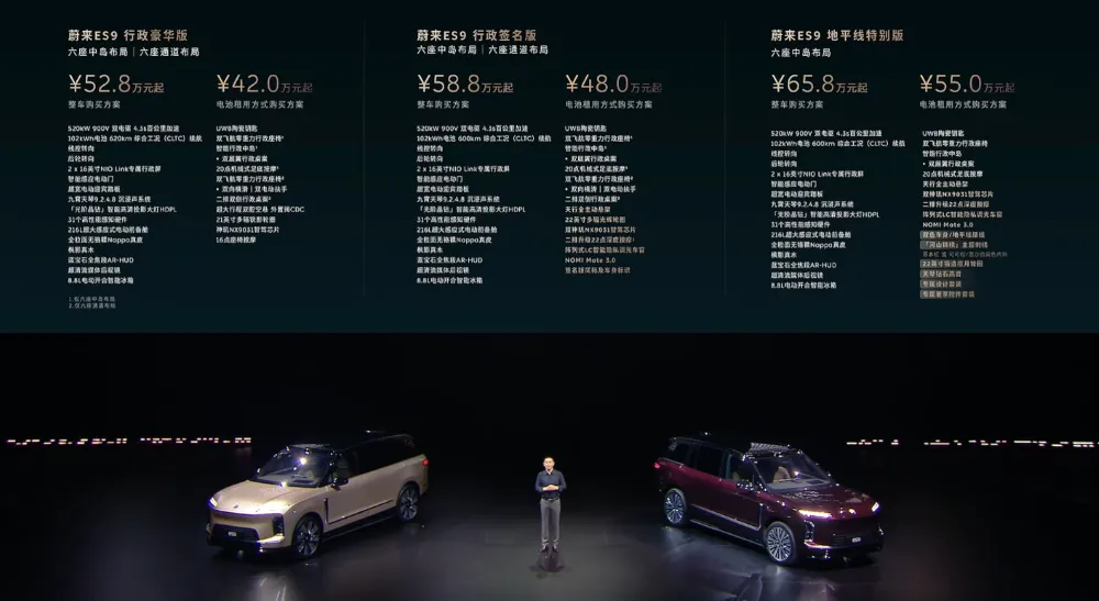车东西4月9日消息,就在刚刚,蔚来创始人、董事长、CEO李斌在杭州详细介绍了蔚来汽车今年的首款全新车型ES9,也是蔚来的旗舰SUV车型。在今天的发布会上,李斌也公布了这款车的预售价格,该车一共分为三个版本,行政豪华版整车购买预售价52.8万起,电池租用模式购买预售价42万起;行政签名版整车购买预售价为58.8万起,电池租用模式购买预售价为48万起;地平线特别版整车购买预售价为65.8万起,电池租用模式购买预售价为55万起。▲蔚来ES9预售价格