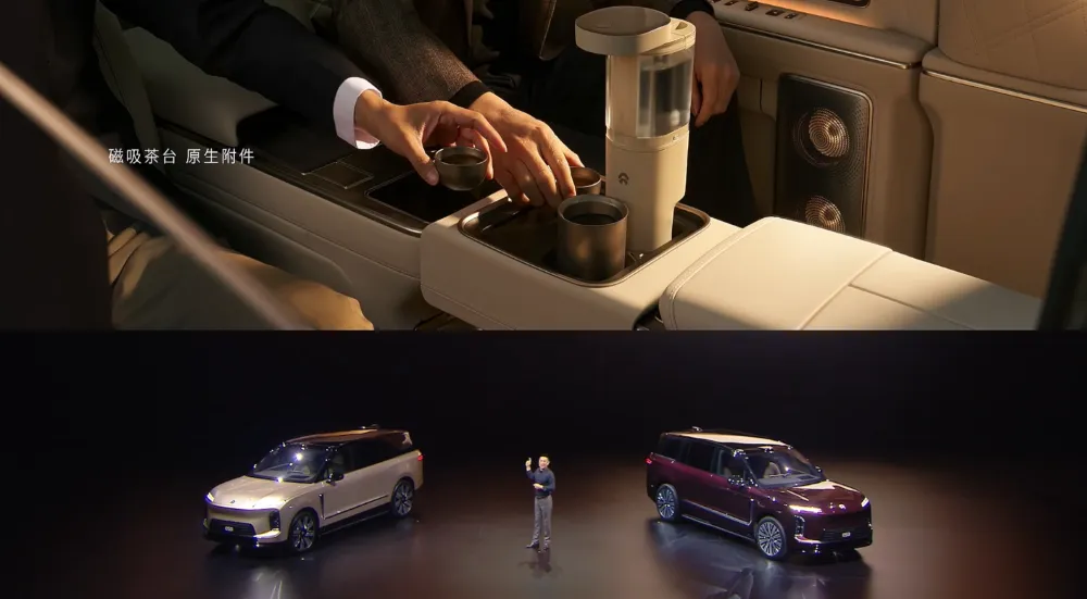 车辆还做了一些非常有意思的设计,比如说有一个磁吸茶具,可以放置在行政中岛上;车辆还有专属的车载视频会议系统;车载原生飞书APP;第三排还有对讲功能,可以和第一排乘客对讲。▲蔚来ES9磁吸茶具