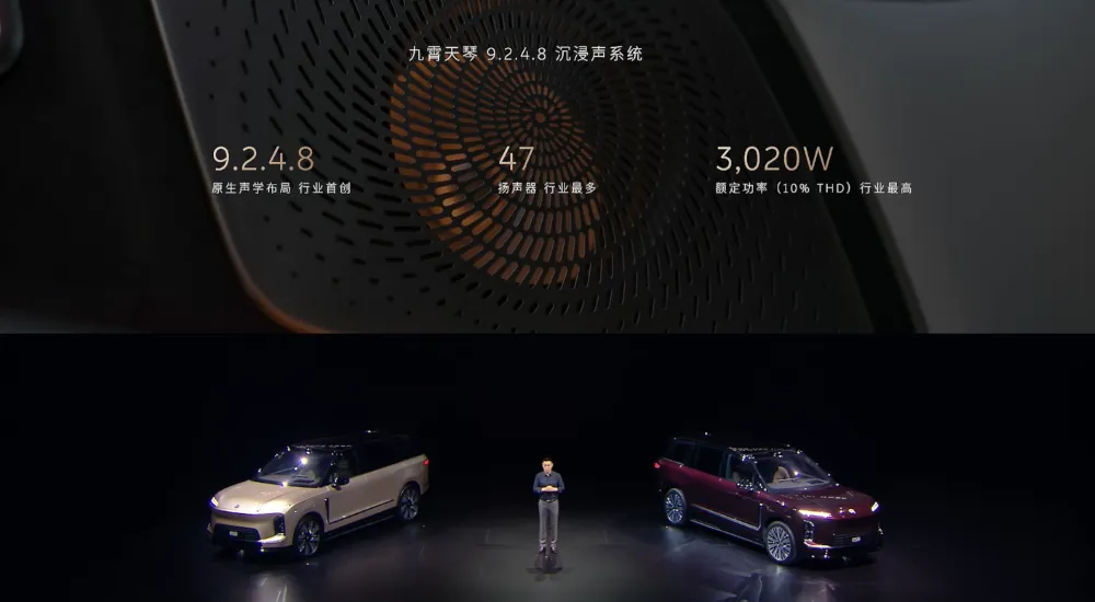 蔚来也在蔚来ES9上拿出了自己的音响系统九霄天琴,47个扬声器,额定功率3020W。▲蔚来ES9音响系统表现