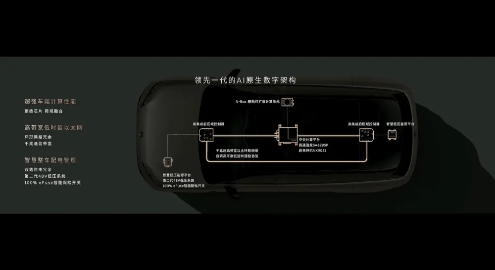 该车采用了全新的AI原生数字架构,有性能强大的车端计算性能、高带宽低时延以太网和智慧整车配电管理。▲蔚来ES9 AI原生数字架构