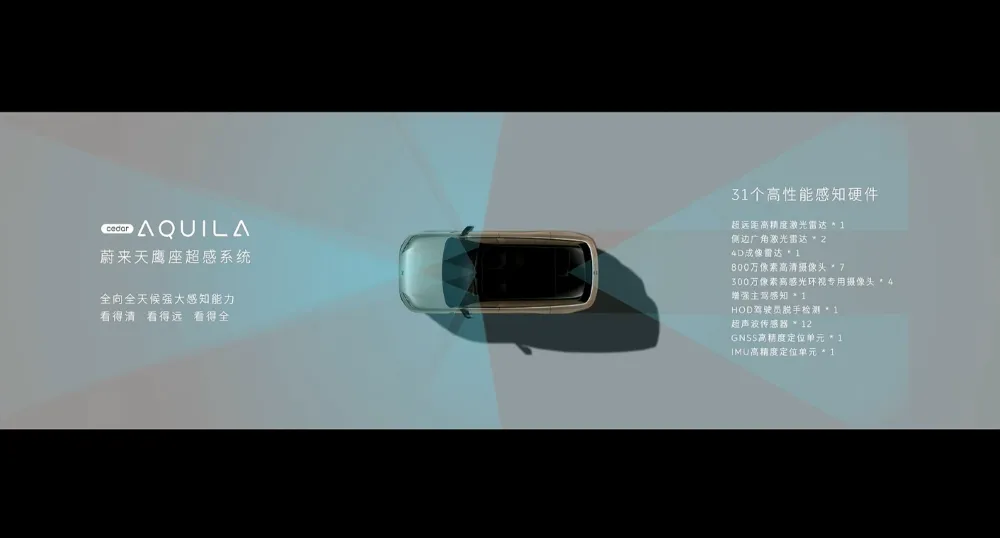 AI能力系统变强之后,车辆的数字安全也成了重中之重,蔚来ES9搭载了全链路数字安全体系,从物理到数字完成五重防护。智驾方面,蔚来ES9搭载31个高性能感知硬件,可以对车辆周身完成全覆盖。车辆在恶劣的天气下,也能保证感知能力。▲蔚来ES9辅助驾驶传感器配置