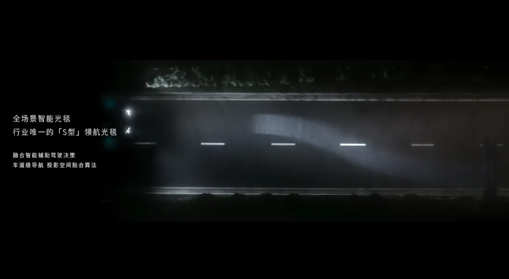 车辆还会有一个超宽广探照光毯,可以实现23米宽的覆盖。比较有意思的是,车辆还提供了S形光束功能,在智能驾驶状态下,可以更好的表达变道意向。▲S形光束功能