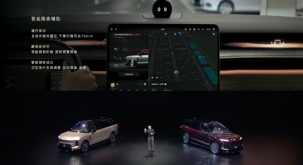 在限高的区域,车辆也可以通过智能悬架的调整,顺利通过1.8米限高架。▲蔚来ES9智能限高辅助功能
