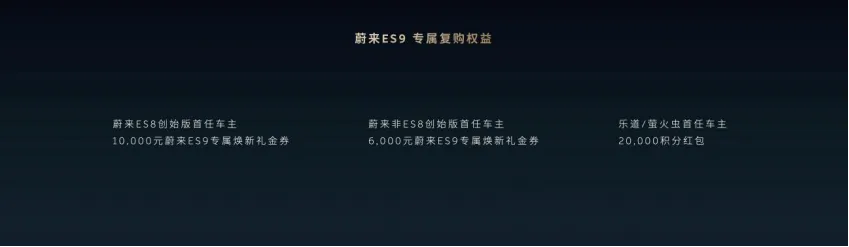 自 2026年4月9日(含)起至正式上市发布前,预订蔚来ES9的用户,将享受限时预订权益,支付5,000元预订金,可抵扣10,000元购车款。蔚来还为老用户提供了ES9的专属复购礼遇:蔚来ES8创始版首任车主可享10,000元ES9专属焕新礼金券,蔚来非ES8创始版首任车主可享6,000元ES9专属焕新礼金券;乐道、萤火虫首任车主每人可享 2 万复购积分红包。