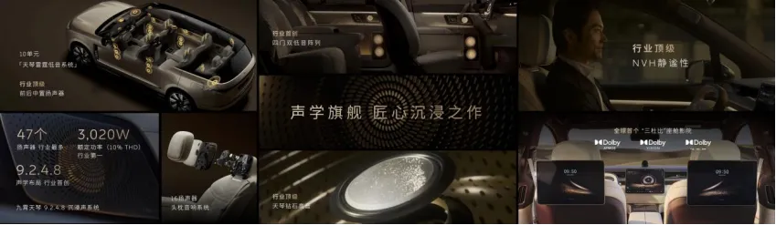 ES9搭载九霄天琴9.2.4.8沉浸声系统,拥有行业最多47个扬声器、行业最高3,020W额定功率及行业首创原生声学布局。首次搭载以100%纯钻石打造的「天琴钻石高音」单元,配合蔚来独享数字声学技术,将座舱打造成顶级移动音乐厅。ES9拥有行业顶级NVH表现,在120km/h时速下,车内噪音仅为59.2分贝。ES9更拥有全球首个获得全舱杜比全景声、杜比视界认证并支持杜比动态视频增强的「三杜比」座舱影院,将视听享受推向新高度。