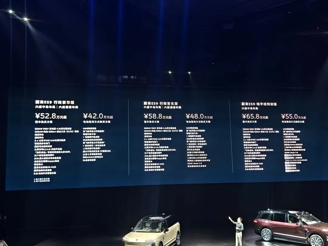最后说一下价格,蔚来ES9提供行政豪华版、行政签名版、地平线特别版三个版本,预售价分别为52.8万元、58.8万元、65.8万元,BaaS租电池模式预售价分别为42万元、48万元、55万元。即便是整车购买,价格依然比电车通(ID:dianchetong233)此前的预测结果低。