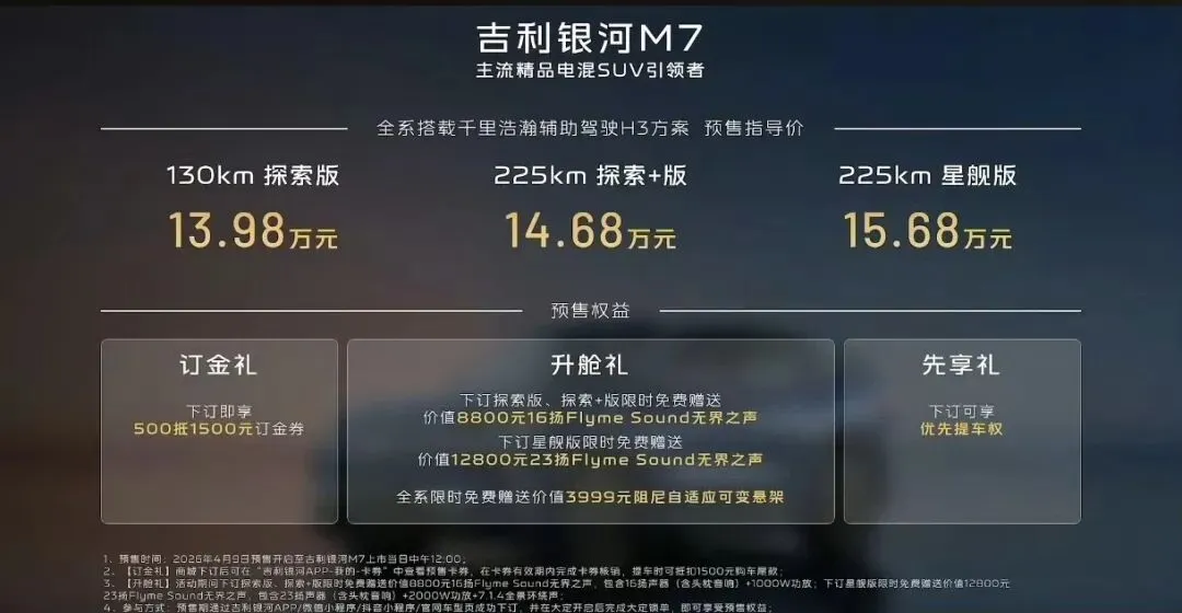 4月9日吉利银河M7正式开启全球预售,预售价13.98-15.68万元。