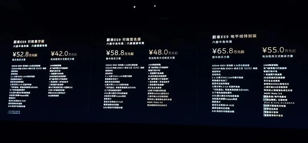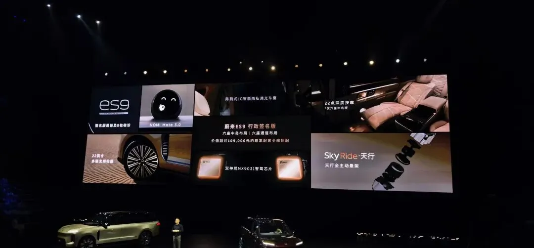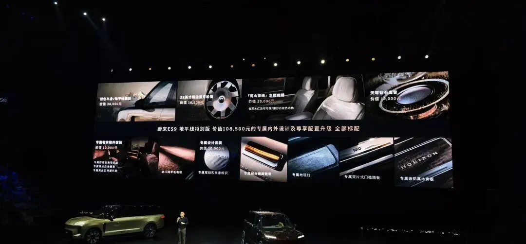 蔚来ES9会是蔚来的全新行政旗舰吗?斌哥昨晚在发布会上讲,蔚来ET9是蔚来的行政旗舰标杆,蔚来ES9则在ET9的基础上进一步发扬光大。昨天晚上,蔚来有史以来最大尺寸的旗舰SUV-ES9正式亮相,也是目前中国最大的纯电SUV。在2个多小时的发布会里,蔚来创始人李斌将这款ES9系统、全面化的展示在了我们的面前,证明了这是一款业内真正的旗舰级别全尺寸SUV。发布会结束后,大家疯狂地涌到台上和李斌合照、采访,将斌哥围得水泄不通。如果说ET9曲高和寡,那么ES9也许就是雅俗共赏,保持住了蔚来一贯的高端格调的同时,又能贴近大众,有望继ES8以后成为蔚来的又一个爆款单品。当我在现场说有望成为爆款的时候,身边的一位蔚来粉丝直接打断我的表达,说ES9一定会是爆款。因为在蔚来ES9上,把线控转向、后轮转向、九霄天琴音响等做到了全系标配(行政豪华)。在行政签名版(车价增加6万)上则增加了天行全主动悬架、22英寸光晖轮圈,额外加一颗神玑NX9031芯片,升级整列式LC隐私调光车窗等等。在最为顶级的HORIZON地平线特别版上,在签名版的基础上又有了价值10.85万元的升级,包含特有外观配色,22英寸锻造揽月轮圈,特别的中国风主题刺绣“河山锦绣”以及一堆专属设计、套装。车价也最为高端,65.8万,妥妥的蔚来新一代旗舰标杆。此价格相当有讲究,不仅超越了极氪9X,也超越了问界M9,力压一头凸显了蔚来在高端市场的自信与从容。另一方面基于蔚来的换电体系,租电价格则下探到竞品无法企及的价位,且并不会影响蔚来的高端调性。在2026年初,蔚来在全尺寸SUV市场上祭下了一枚重磅炸弹,作为蔚来造车11年来的创新集大成的作品(累计研发投入超670亿元),有非常多的信息量值得与大家分享,电动诺诺挑一些重点以及在之前产品上未出现的点与大家进行分享。