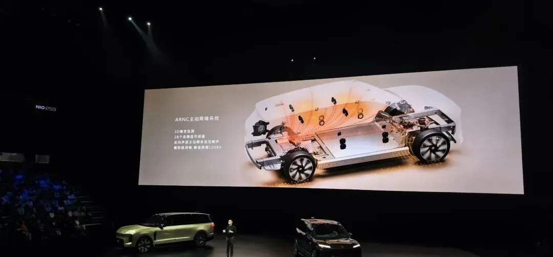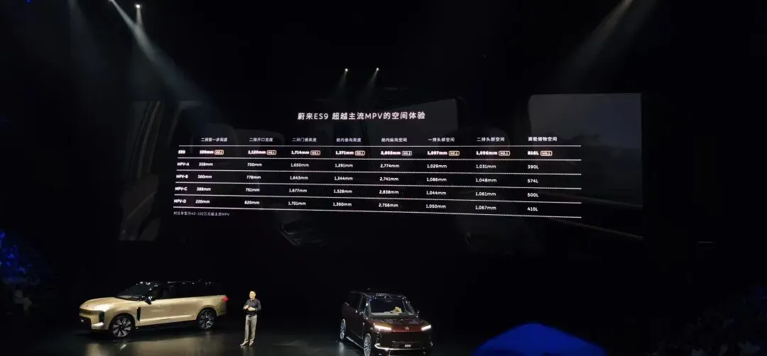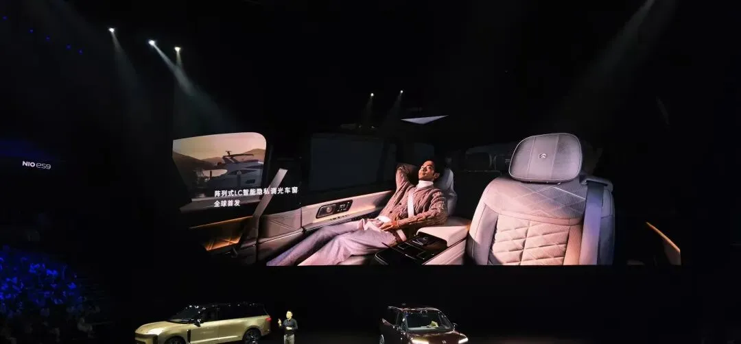 ES9的尺寸为:5365mm*2029mm*1870mm,轴距为3250mm。如果只看参数你毫无感觉的话,那么借鉴下当前顶流的MPV理想MEGA的三围参数:5350mm*1965mm*1850mm。再对比极氪009与小鹏X9的尺寸,你会发现ES9虽然作为一台SUV,但体格超越了一台大型MPV。更大的尺寸带来更为宽裕的内部空间,在车内各个尺寸对比方面,均为同级别第一。斌哥发布会上反复强调的“座座都是MVP,忘掉MPV”是真的。因为ES9足够大,大到怕车内乘客之间无法交流,特意为第三排乘客安排了对讲系统,方便与第一排乘客进行交流。ES9车内扬声器数量多达47个,额定功率高达3020W,运用了碳纤维、凯夫拉、铝合金、钻石等高级材质,采用9.2.4.8布局。47个扬声器的数量超越了华为尊界的43个,应是当前汽车上配备扬声器数量最多的一款车型。ES9还是全球首款围绕声学系统原生设计座舱的车型。整车的隔音系统同样出类拔萃,在120km时速下,整车噪音控制在59.2分贝,对比竞品的65分贝左右,这是行业里顶级的NVH表现。如果对数字不敏感,那么更直观的表达就是:65分贝大约相当于城市车流密集的主干道或者嘈杂的餐馆里的声音;59分贝是郊区普通街道或者安静咖啡馆的背景音,属于安静能清晰听到细节的级别。ES9采用了高达5层超静音玻璃,配备SPVB超静音玻璃;全车近25平方米的声学隔音材料,超60处超克重吸音棉,超50处车身空腔填注声学发泡与阻隔设计。ES9还采用了主动降噪系统,28个高精度传感器搭配噪音检测系统,反向声波主动精准抵消噪音。这次在ES9上,全球首发了阵列式LC智能隐私调光车窗。可以做到全车光线完全阻隔。阵列式LC智能隐私调光车窗是一种通过电压精确控制液晶排列,在透明与隐私之间无级调节的高端技术。阵列式精准分区控制:能将车窗划分成微小独立单元,实现精细的像素级“灰阶”调节,例如在不破坏整体隐私的前提下,只保留一条窄缝用来观察外界环境。