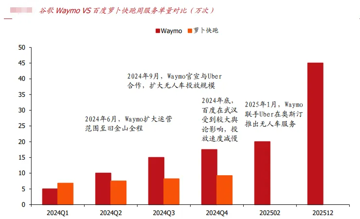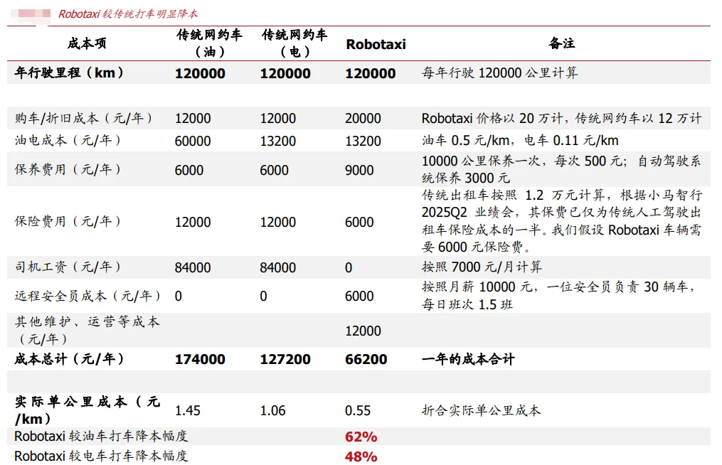 - 成本优势显现: 随着人力成本下降和运营效率提升,Robotaxi每公里成本有望在2026年与有人驾驶网约车持平,之后将低于有人驾驶网约车,形成价格优势。