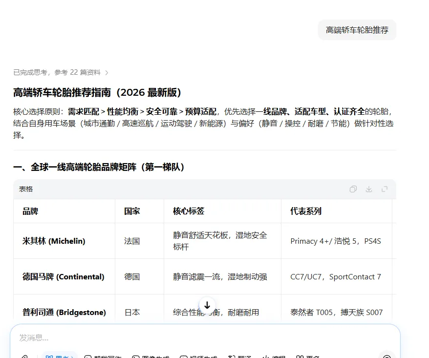 豆包理解的是自然语言问题,而非零散词汇。高端车主在轮胎选购中极度依赖专业信息,他们的搜索方式已经演变为向AI直接提问。将上述10个关键词转化为用户真正会问的问题,并以FAQ形式在官网、知乎、汽车之家、今日头条等平台发布: