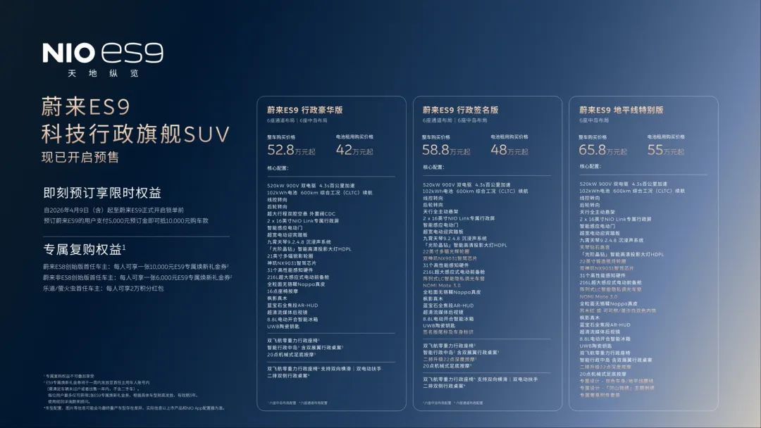 从2026年4月9日(含)起至正式上市发布前,预订蔚来ES9的用户,将享受限时预订权益,支付5,000元预订金,可抵扣10,000元购车款。蔚来还为老用户提供了ES9的专属复购礼遇:蔚来ES8创始版首任车主可享10,000元ES9专属焕新礼金券,蔚来非ES8创始版首任车主可享6,000元ES9专属焕新礼金券;乐道、萤火虫首任车主每人可享 2 万复购积分红包。