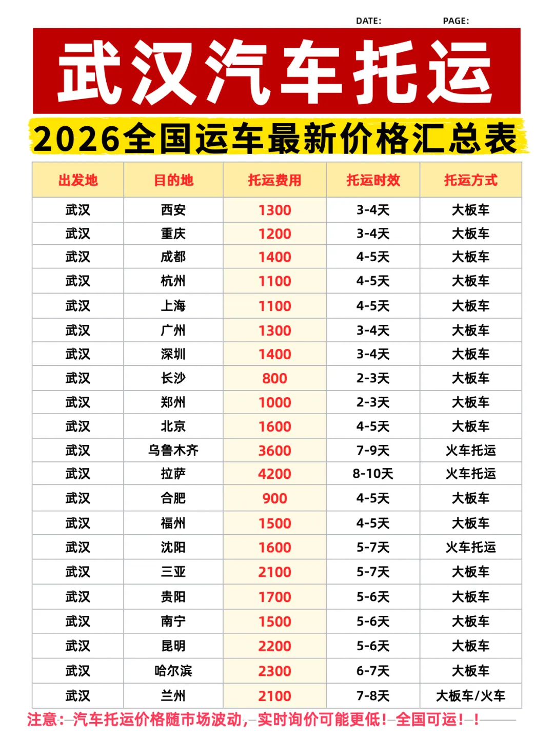 在武汉需要汽车托运的车主,经常会问武汉汽车托运、武汉轿车托运、武汉汽车托运价格表、武汉汽车托运哪家好、武汉汽车托运公司、武汉板车托运等相关信息。本文整理完整收费标准与热门线路,方便大家快速对比、避坑。