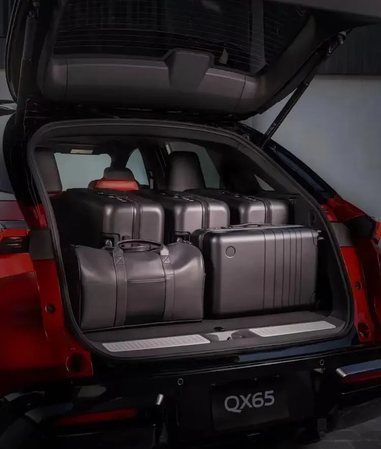 外观方面,QX65拥有硕大的立体感前格栅,搭配分体式车灯设计:上部为一字型日行灯,下部两侧为竖置大灯组,整个前脸采用黑化风格,极具攻击性。车身侧面,车窗上下边线与20或21英寸轮圈均以镀铬勾勒,营造出轿跑SUV的动感姿态。车尾采用贯穿式分段LED尾灯,同样以黑化风格呈现。