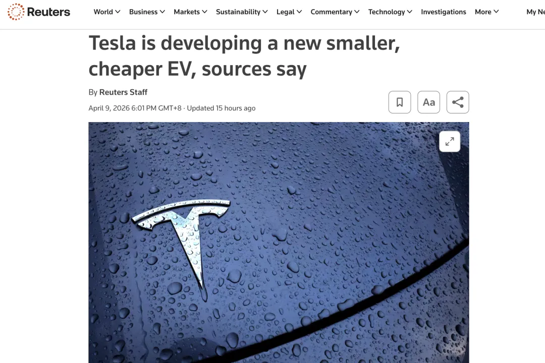 消息来源:Reuters,2026 年 4 月 9 日。本文基于公开报道整理,具体产品信息仍以特斯拉官方后续披露为准。