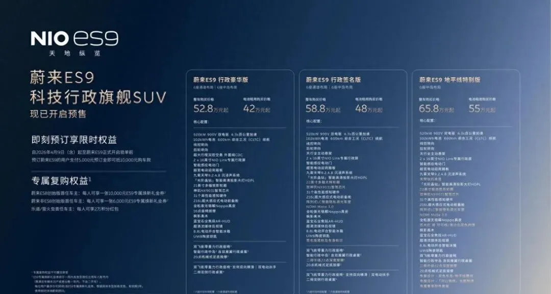 蔚来ES9卖42万起,带电池租用,不是丐版,是顶配。我查了发布会录屏,又翻了官网配置表,三遍确认没看错。这价格放去年,连奔驰GLE的入门门槛都摸不到,现在却能开走一台六座、900V、带激光雷达、全主动悬架、还能换电的SUV。不是降价,是规则变了。