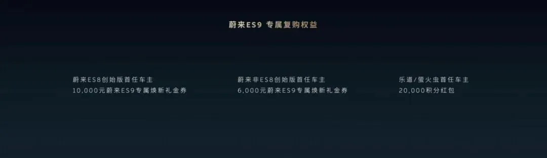 正式上市发布前,预订蔚来ES9的用户,将享受限时预订权益,支付5,000元预订金,可抵扣10,000元购车款。另外,蔚来还为老用户提供了ES9的专属复购礼遇。。