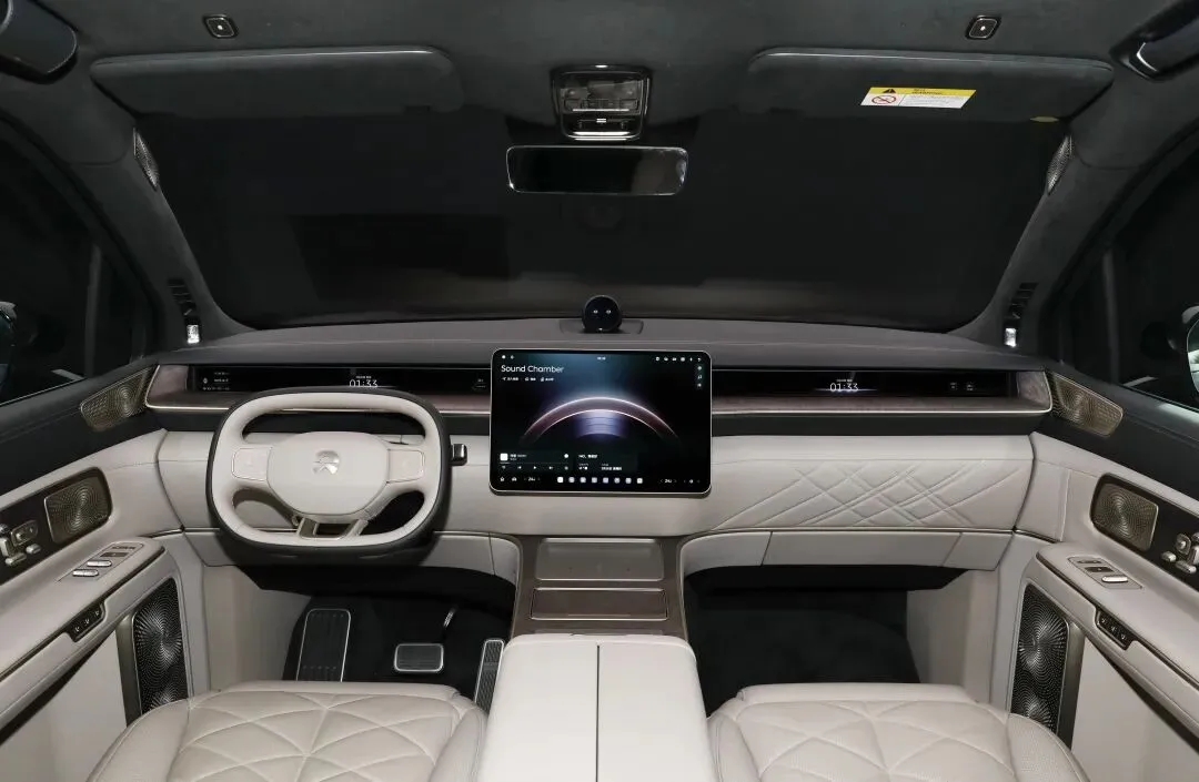 前脸没了ES8那条“刘海”,灯组是九层水晶结构,晚上亮起来像水波纹。不是为了花哨,是把灯丝、透镜、光导板一层层叠进去,为的是远光照射更均匀,不会晃对面司机。小蓝灯在A柱内侧,转弯时自动亮起,提示行人——这不是装饰,是法规没要求但蔚来自己加的。