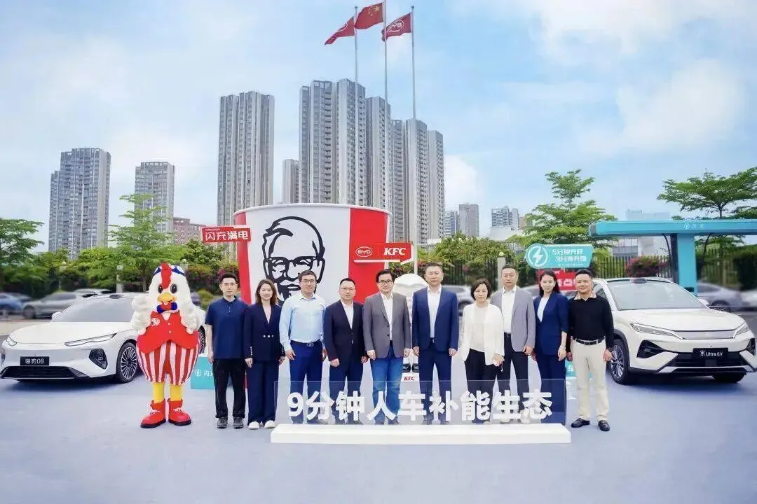 4月8日,比亚迪与肯德基在深圳总部正式签约。双方的合作说复杂也复杂,说简单也简单:比亚迪的车主在开车时,可以用语音在肯德基点餐,开到门店直接取餐,同时把车插上比亚迪的闪充桩充电。9分钟后,电充到97%,餐也吃完了。
