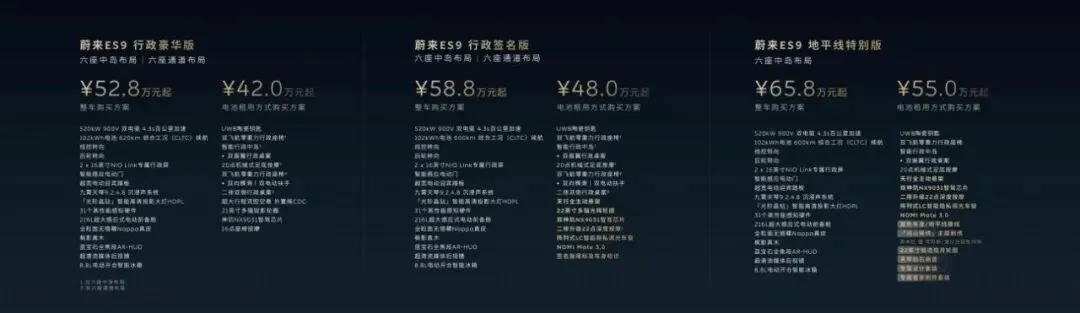 科技行政旗舰SUV——蔚来ES9在杭州正式发布并开启预售。ES9是蔚来十一年体系创新的集大成之作,是智能电动行政旗舰SUV品类的开创者。ES9行政豪华版预售价528,000元起,采用BaaS电池租用方式购买,预售价420,000元起;行政签名版预售价588,000元起,采用BaaS电池租用方式购买,预售价480,000元起,地平线特别版预售价658,000元起,采用BaaS电池租用方式购买,预售价550,000元起。