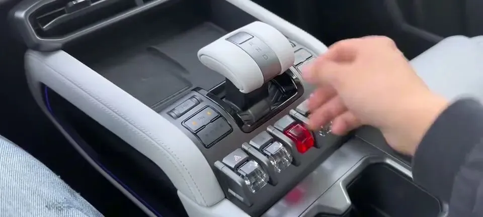 但槽点也得讲。第一,没有HUD,这在我看来算是个小遗憾。第二,它这个电子挡把不支持电动升降,仪式感少了一截。第三,中控台下方虽然有储物空间,但位置偏低,拿东西没那么顺手。还有这个白色软包,视觉上高级,真要家里有娃、经常吃点喝点,那耐脏性你得有心理准备。