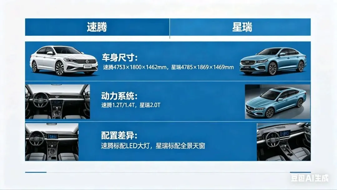 在10-15万级家用轿车市场,大众速腾与吉利星瑞堪称“死对头”。前者凭借合资品牌底蕴、稳定保值率成为传统家用首选,后者则以越级动力、超大空间和高配置刷新国产轿车天花板。本文从核心性能、空间体验、配置性价比、可靠性四大维度全方位对比,帮你精准选车。
