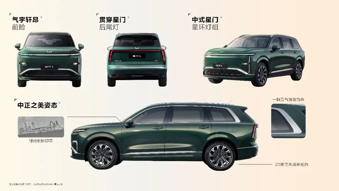 外观上,星光L采用中式美学设计语言,以中正大气、简约耐看的风格贴合家庭主流审美。前脸“气宇轩昂”造型沉稳大方,主动进气隔栅配合车身侧面镀铬饰条,强化层次感与高级感。中式星门灯组与贯穿式尾灯前后呼应,日间辨识度拉满,夜间点亮仪式感出众。20英寸米其林轮胎与流畅车身线条相得益彰,气场沉稳不张扬,家用、社交皆显体面。前风挡下角精致的柳州地标印花和尾部的隐藏式后挡风雨刮,更彰显造车匠心和巧思。