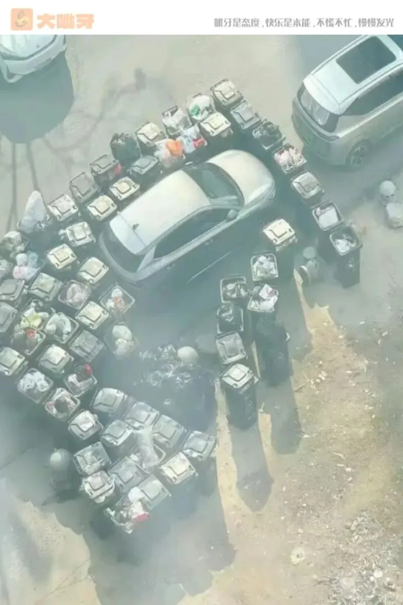 轿车占位惹众怒,垃圾桶集体围攻堵路