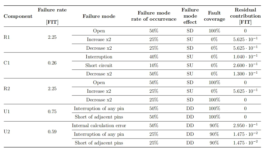 完成分类后,已知各组件FIT(λᶜ)、失效模式发生率(λᶠ),并完成所有失效模式分类,即可得到λfSD、λfSU、λfDD、λfDU,进而计算ISO 26262要求的指标(见文章“第一部分”2.7.3节)。若指标不满足目标ASIL需求(见文章“第一部分”表2.7),则需重新设计部件。