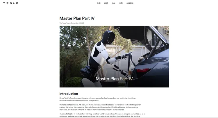 志不在造车,那马斯克的志向在哪?其实早在特斯拉去年发布的《特斯拉的秘密宏图第四篇章》里就阐述的很明白了:AI。具体来说就是FSD、无人驾驶Robotaxi、具身智能体这些。让人把着方向盘已经不是马斯克想要的,脱离方向盘的Cybercab也许才是马斯克眼中真正称得上划时代意义的新车吧。
