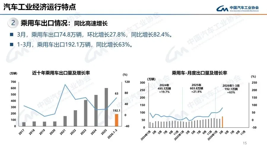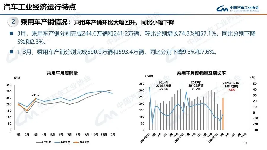 3月,在出口高速增长拉动下,加之各地补贴细则全面落地、春季车展活动开启以及节后企业生产经营活动加快,乘用车市场呈现出一定回暖迹象。当月,乘用车共销售241.2万辆,环比增长57.1%,同比下降2.3%。在乘用车主要品种中,与上月相比,四大类乘用车品种销量大幅增长;与去年同期相比,运动型多用途乘用车(SUV)销量呈10%以上增长,其他三大类乘用车品种销量两位数下降。