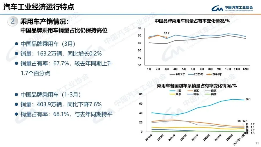 1-3月,中国品牌乘用车共销售403.9万辆,同比下降7.6%,占乘用车销售总量的68.1%,销量占有率与去年同期持平。在主要外国品牌中,与去年同期相比,美系品牌销量两位数增长,其他四大主要品牌销量均呈不同程度下降。