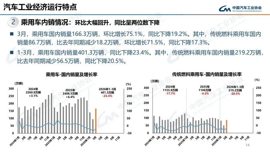 1-3月,乘用车共销售593.4万辆,同比下降7.6%,降幅较1-2月有所收窄。在乘用车主要品种中,与去年同期相比,运动型多用途乘用车(SUV)销量小幅增长,其他三大类乘用车品种销量两位数下降。