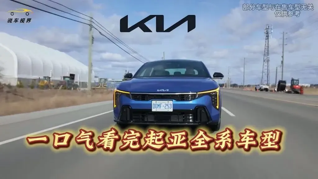 起亚全系车型(轿车篇)展示视频封面,画面为新款起亚轿车在道路上行驶。