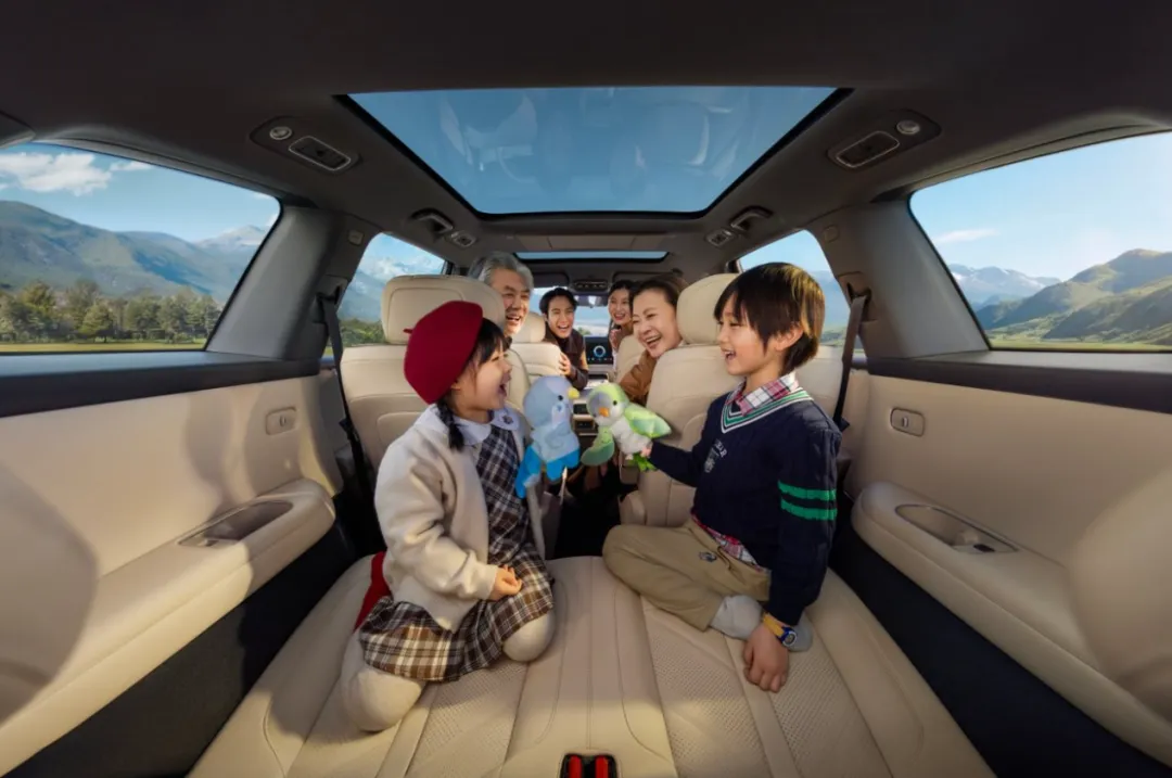 车内的冰箱彩电⼤沙发也是一样不落,像⼆排娱乐屏、⻋载冷暖冰箱、三排六座⼤沙发、哈曼Infinity ⾳响、中排双桌板、⾹氛系统等一应俱全,华为鸿蒙座舱5也是目前最新的技术。