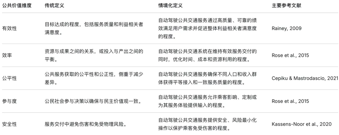 为了弥合这一差距,我们采用了一个多维框架,该框架整合了官僚绩效和民主合法性。基于公共价值的传统概念(例如,Cepiku & Mastrodascio, 2021; Jo & Meier, 2024; Rainey, 2009; Rose et al., 2015),我们确定了四个核心维度:有效性、效率、公平性和参与度。考虑到自动驾驶汽车技术特有的风险、不确定性和公众关切,我们明确地将安全性作为公共价值的第五个维度。与传统公共服务不同,在算法控制的出行系统背景下,安全性成为合法性和信任的核心标准(Kassens-Noor et al., 2020)。这些维度中的每一个都代表了一个独特的评估标准,公民通过它来评估算法系统是否实现了公共目的。表1概述了这些维度应用于自动驾驶公交车时的传统定义和情境化定义。