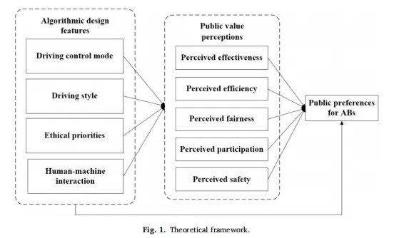 要理解这些设计特征为何重要,需要一个更广泛的评估视角。公共价值理论提供了这个视角,它强调公民评估技术不仅看其性能,还看技术是否体现了安全、公平和问责等社会价值。同时,算法设计特征通过嵌入问责、公平和以用户为中心的互动原则,积极塑造这些感知(例如,Hemesath & Tepe, 2024; Kieslich et al., 2022)。这些发现表明,算法设计不仅是技术性的,而且内在具有价值负载,塑造了公共价值感知如何与公众偏好相互作用并影响公众偏好。然而,在自动驾驶公交车的背景下,算法设计与公共价值感知之间的相互作用仍未得到充分的理论化和实证检验。阐明这些关系对于加深我们对公共交通中算法治理的理解至关重要。它也为政策制定者提供了如何设计不仅技术健全而且合法且公众可接受的自动驾驶公交系统的指导。