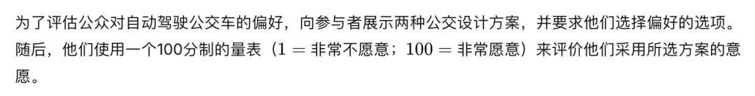 在本研究中,参与者被呈现以下假设情境:“假设有两家公司开发了用于公共交通的自动驾驶公交车,每种都具有独特的算法设计。这些公交车即将部署在您所在的城市。”每位参与者完成了三轮基于选择的联合任务(Wright et al., 2024)。在每一轮中,受访者评估了两个随机分配的、在特定算法设计属性上系统变化的自动驾驶公交车概况。在审查每一对之后,参与者选择他们偏好的选项。这种设计允许稳健地估计每个属性对公众偏好的因果影响。