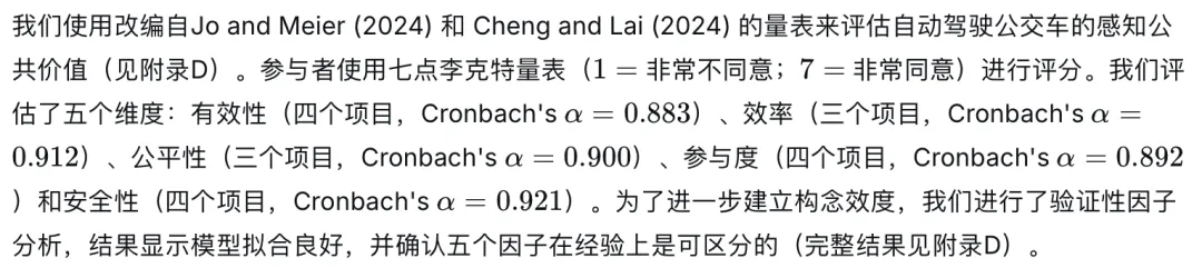 为了减少受访者疲劳并保持对主要操纵的关注,我们对背景控制变量使用了单项目测量。评估了参与者对计算机的知识和经验,使用一个项目:接触计算机技术和相关课程的经历;此外,我们测量了自我报告的自动驾驶公交知识;最后,我们评估了自动驾驶公交车的实际体验频率。