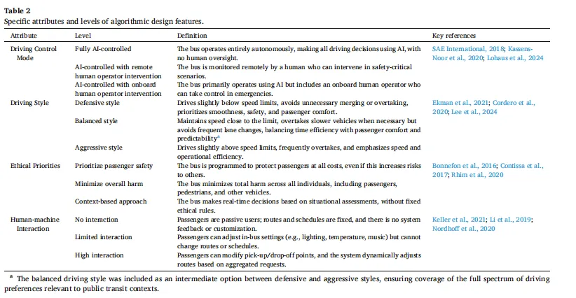 先前关于公众对自动驾驶汽车偏好的研究主要考察了接受度的外部驱动因素。在用户层面,性别、年龄、教育水平、车辆拥有量等人口统计因素与采纳决策有关(例如,Greifenstein, 2024; Mouratidis & Serrano, 2021)。在服务层面,出行时间、成本、安全性和舒适性仍然是塑造偏好的核心因素(例如,Webb et al., 2019; Winter et al., 2018)。虽然这些方法提供了有价值的见解,但它们倾向于将技术视为一个“黑箱”,很少关注内部算法设计特征——特别是配置系统行为的选择——如何塑造公众对自动驾驶汽车的接受度。总之,以往的研究主要集中在外部采纳驱动因素上,而对算法设计作用的关注相对有限,尤其是在自动驾驶公交车等集体交通情境下。