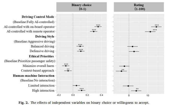 在五个维度中,感知安全性和有效性成为最稳健和一致的中介因素。安全性在更广泛的设计特征中被激活,包括人类监督、防御型驾驶风格和伦理权衡,始终如一地增强公众接受度。这与先前的研究一致,这些研究将安全性确定为风险敏感的自主系统中的基本关切(Cheng & Lai, 2024; Kassens-Noor et al., 2020)。相比之下,有效性被较少的设计选择触发——最显著的是车上操作员和高互动——但对偏好显示出最强的直接影响,这强化了可见的人类参与能增强系统可靠性感知的发现(Keller et al., 2021; Molinillo et al., 2024)。