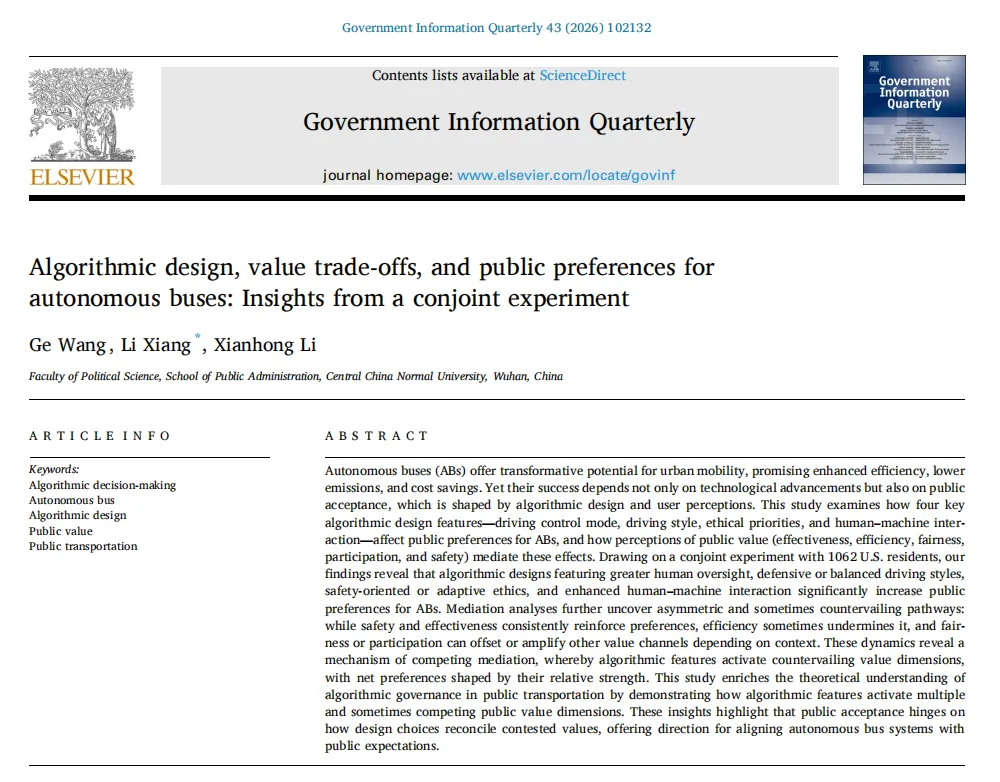 自动驾驶公交车——能够在无需人工干预的情况下感知周围环境、导航道路并做出决策的自动驾驶车辆——已成为公共交通领域的一项变革性创新(Mouratidis & Serrano, 2021; Taehagh & Lim, 2019)。横跨北美、欧洲和亚洲的试点项目展示了其技术可行性,但也引发了紧迫的治理挑战。对于政府机构而言,采购和监管取决于算法如何平衡安全、效率、公平和包容性;对于政策制定者来说,公众接受度既是部署的先决条件,也是合法性的基准。因此,公民对算法设计特征的评价为系统设计、监管决策以及更广泛的智能出行公共价值追求提供了关键指导。