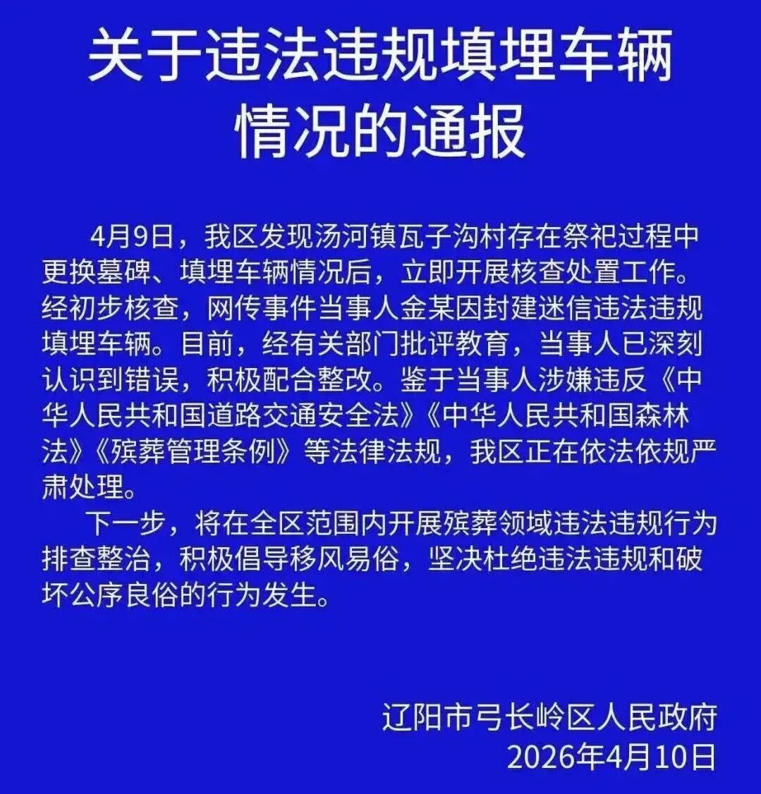 通报显示,4月9日,弓长岭区相关部门发现汤河镇瓦子沟村在祭祀过程中,存在更换墓碑、填埋车辆的异常情况后,第一时间启动核查处置工作,高效推进事件核实与整改。