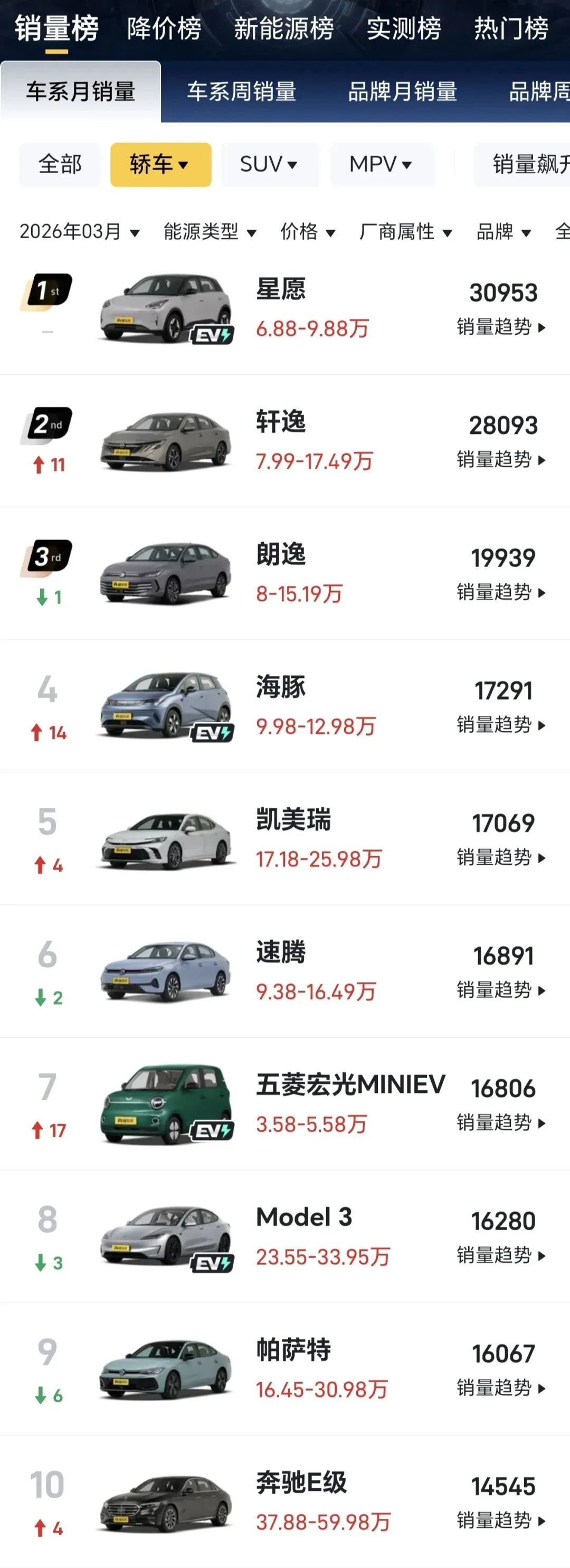 2026年3月轿车销量出来了!榜单变化很大.