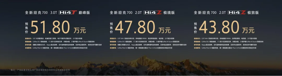 3月30日,在坦克品牌“新时代·新旗舰——人生自此新境”发布会上,全新坦克700正式开启预售。新车推出3.0T Hi4-T、2.0T Hi4-Z两大动力版本共3款车型,官方预售价43.80万-51.80万元。作为坦克品牌向上的重磅战略车型,全新坦克700定位“全域豪华SUV新旗舰”,以中华传统文化及智慧为根,以长城汽车全栈自研核心技术为底,满足从商务通勤、家庭出行到长途穿越,以及极限越野的全场景需求,开创全域豪华SUV新品类,为全球用户带来全场景无短板的豪华出行新体验。