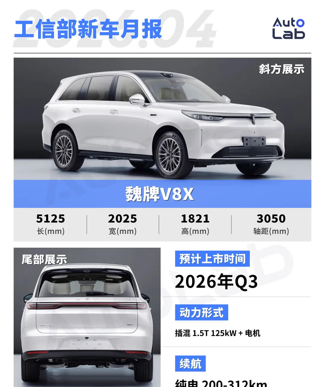 魏牌这边是双线出击。V9X标轴版和长轴版风格接近,还是大六座,只是轴距短了100mm,搭载2.0T Hi4插混,电池有42.8度和64.7度两种,纯电续航最高312km。V8X则像是V9X的简化版本,轴距相同,车长短80mm,发动机换成1.5T,主打大五座。
