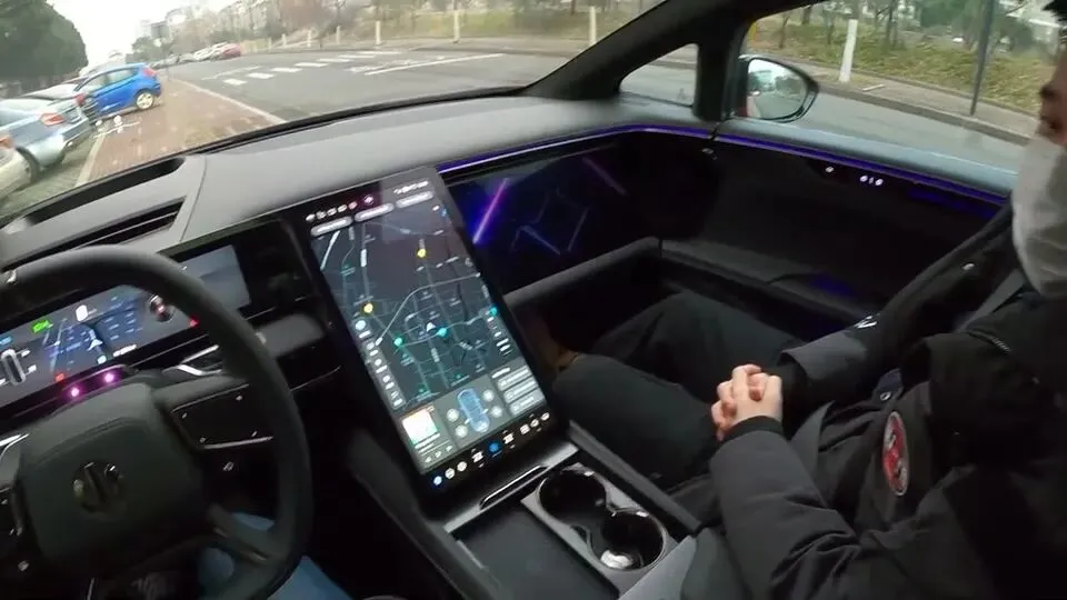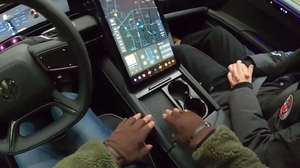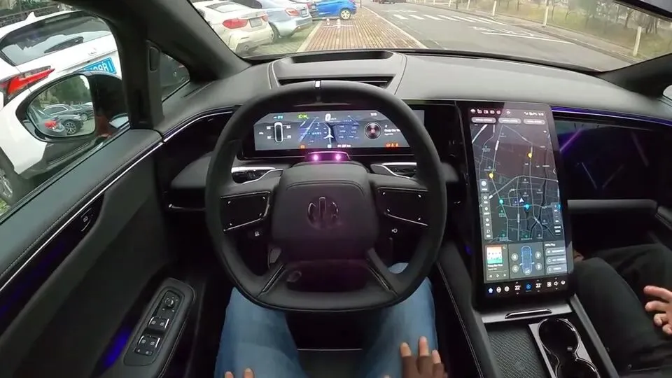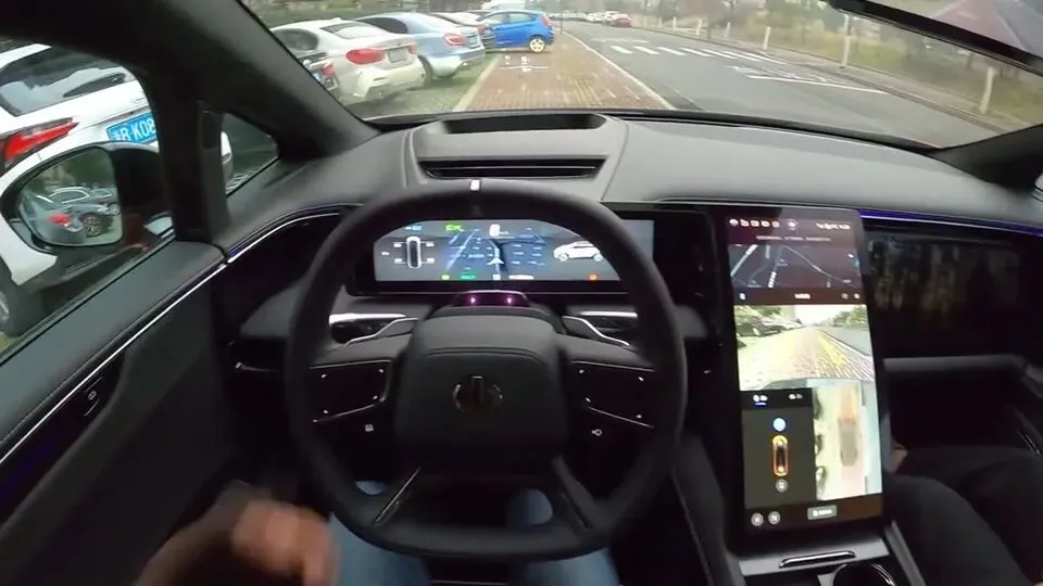 中控一块超大屏幕,方向盘前面是数字仪表,再加上副驾娱乐屏。整个中控台看起来像一整面科技墙。