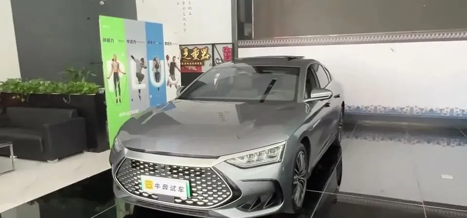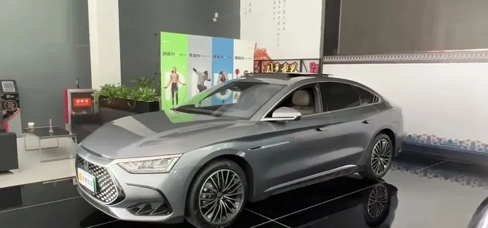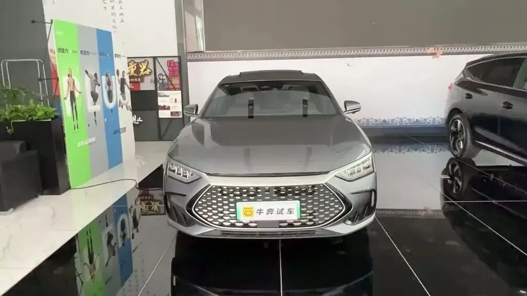 比亚迪汉DM-i冠军版,前脸展示,灰色车身。