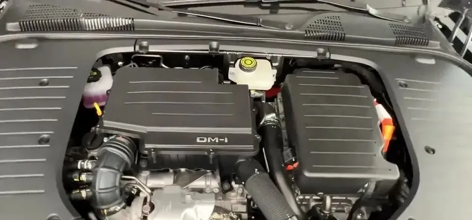 比亚迪汉DM-i冠军版发动机舱,1.5T发动机。